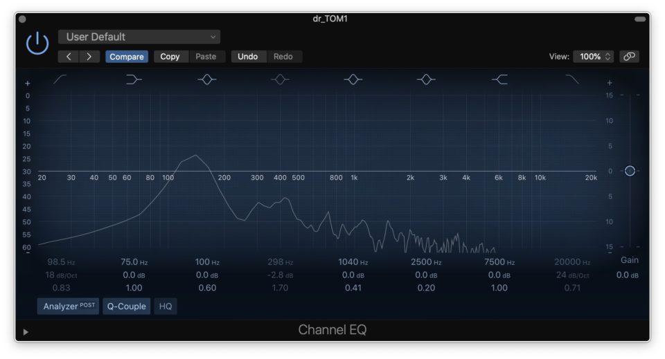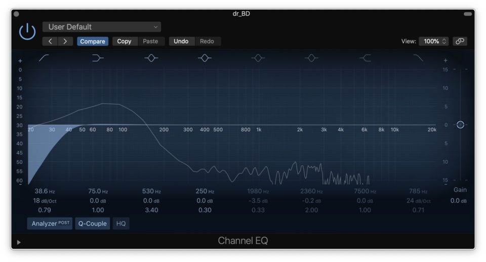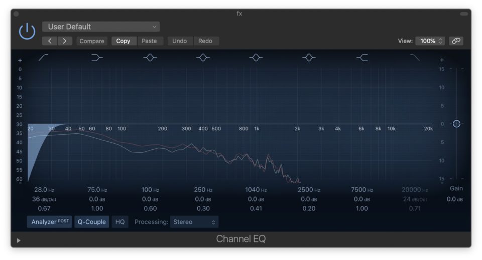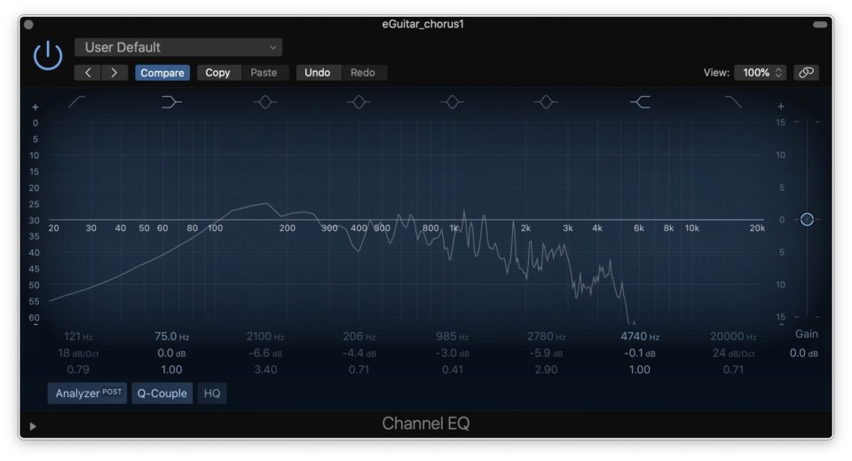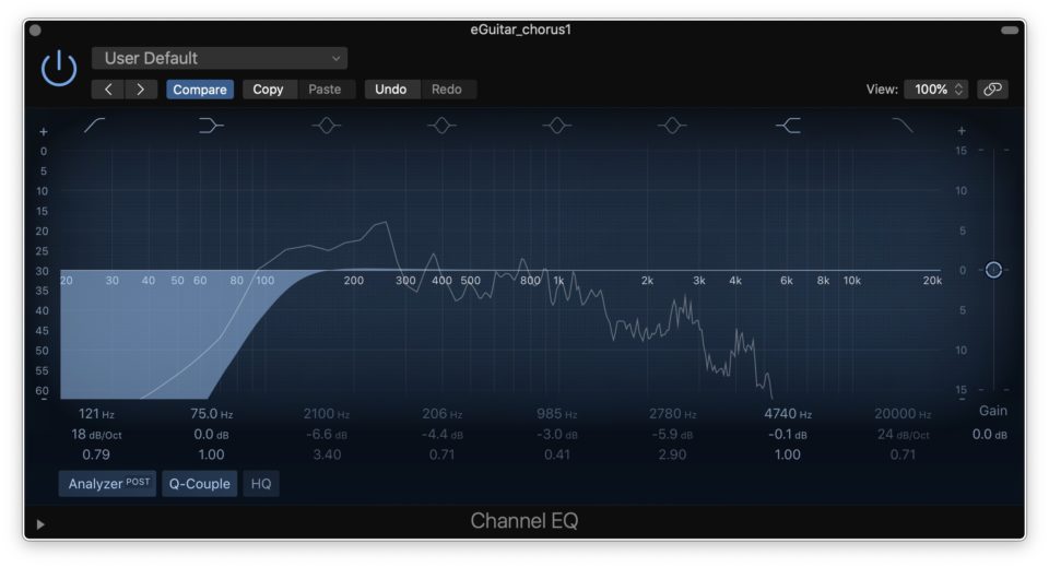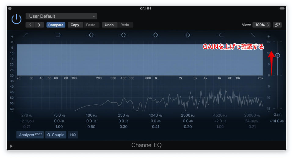ここでEQをオンの状態とバイパスした状態で音を聴き比べてみましょう。