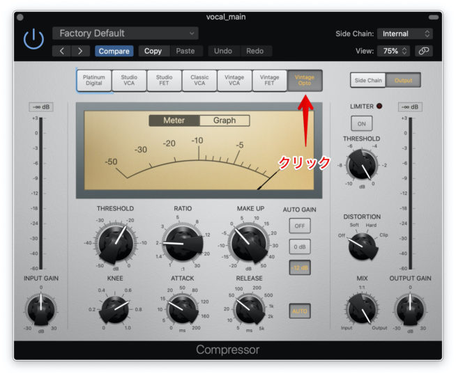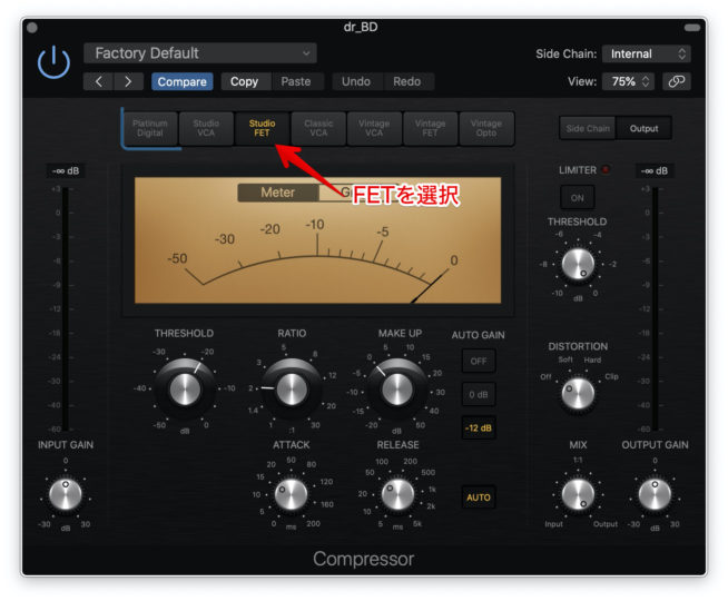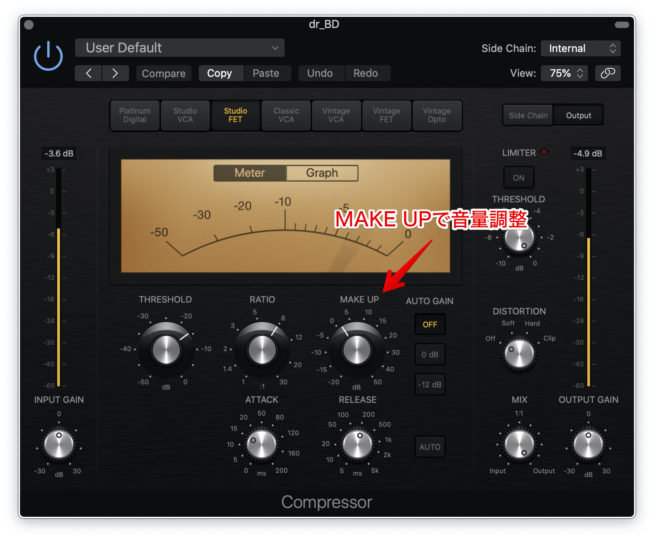 ここで以降すべてのコンプに共通する設定なのですが、「AUTO GAIN」と「AUTO」をオフにします。