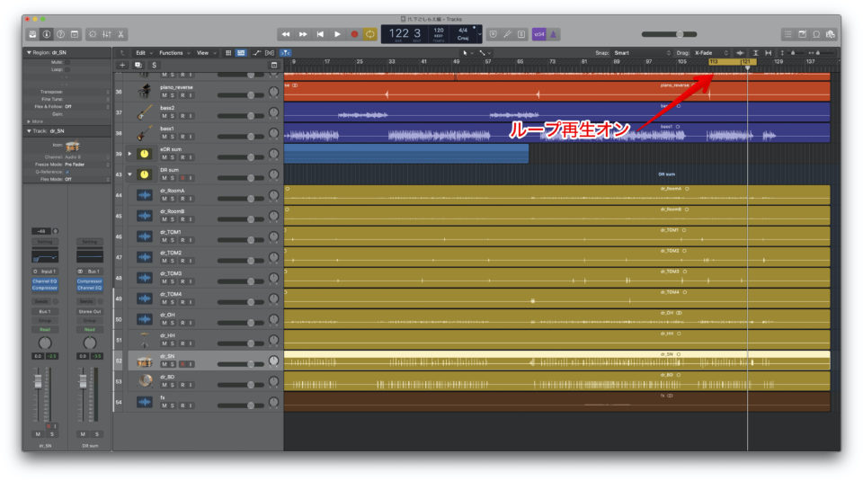 まずミキシングを行うときは、すべての楽器が入っている部分(大概は最後のサビ部分)がよいので、教材の113小節目あたりで、ループ再生にしておくとよいでしょう。