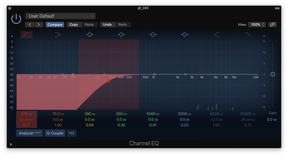 バスドラムやベースが主役の帯域まで音が出てしまっているのでそれをカットします。