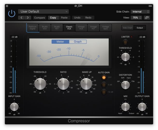 できたら、コンプをバイパスしたりオンにしたりして、音量差を比べてみましょう。
