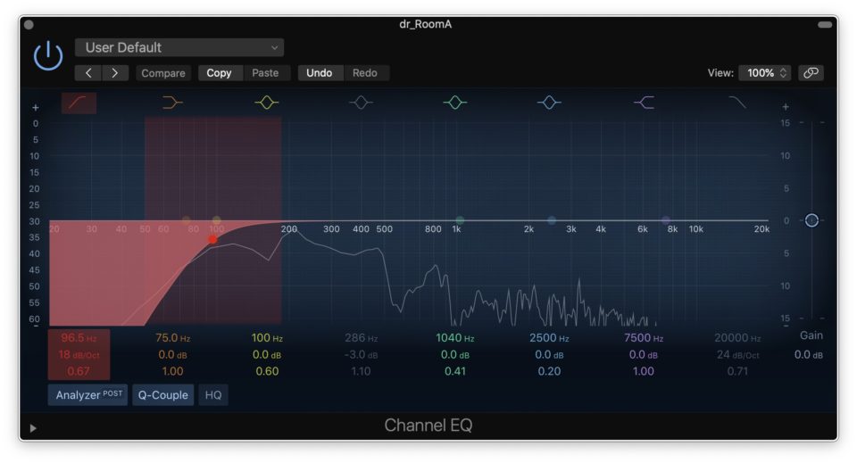 主にローカットと、コンプレッサーによるレベルの均一化をすることが主眼であり、ここではPANの設定などはまだ行いません。