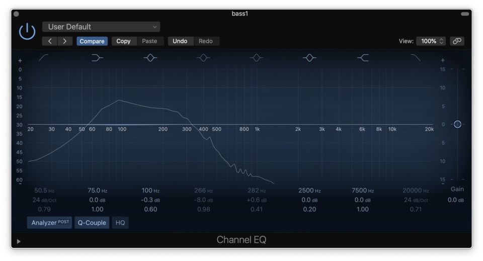 50-100Hzは本来ならばバスドラムと被ってしまう帯域ですが、後にもうひとつの重なり解決方法「サイドチェイン」を行うため、ここでは低音をとっておきます。