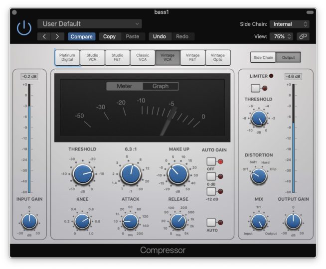 前述の通り、低音部分は積極的にコンプで音を潰して平坦化したいので、