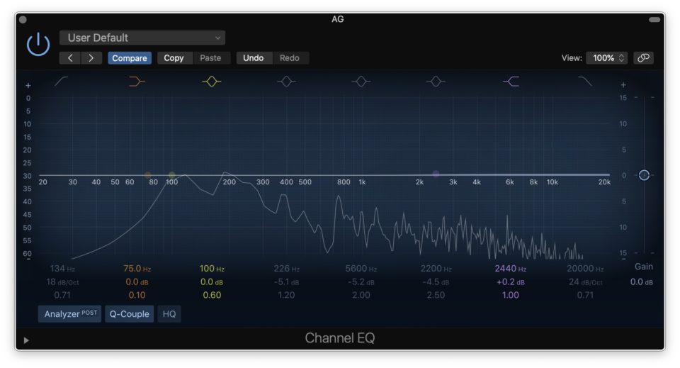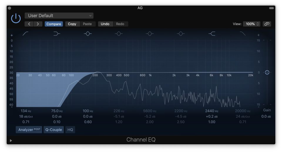 こういったバンドもののアコースティックギターの低域もバッサリきります。目安は大体150Hzです。