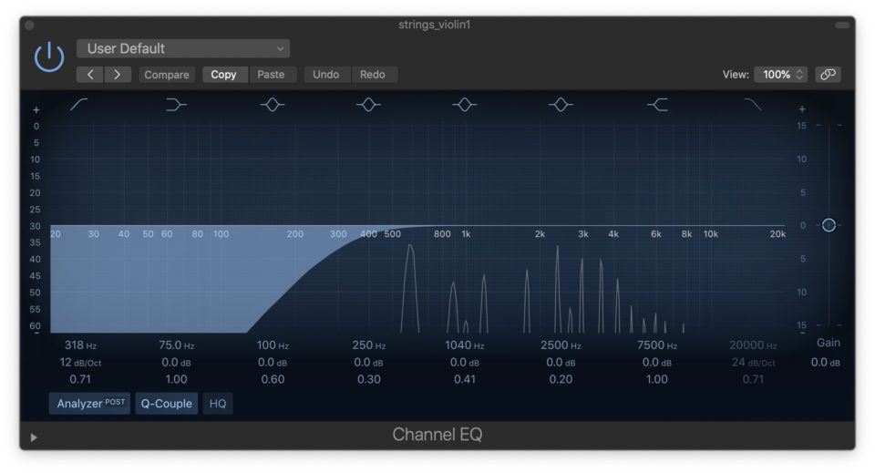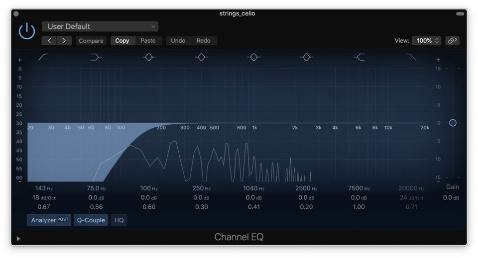チェロのローを効かせたいときなど、カットする周波数は様々ですが、それぞれ以下のような設定としました。