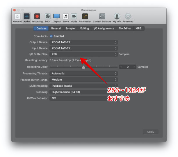 Macのスペックが足りずに再生ができない場合は、「Logic」-「初期設定」-「オーディオ」でI/Oバッファサイズを上げてCPUに負荷がかからないように設定しましょう。