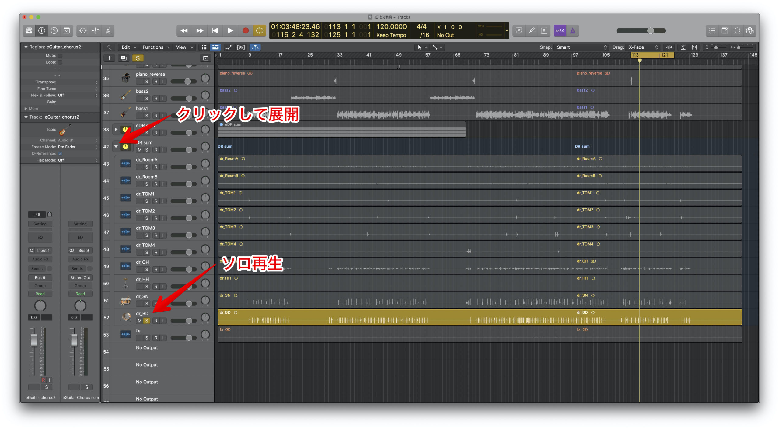 DR Sumを展開して、「dr_BD」トラックについてソロ状態にして聴いてみましょう。
