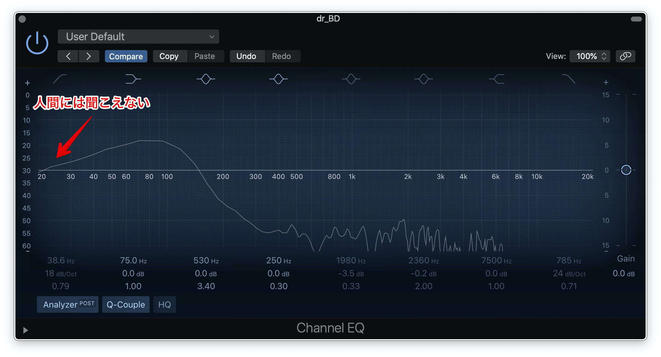 上の図のようにかなり低域まで音が出ていることがわかりますが、人間には聞こえない帯域を切ってしまいます。