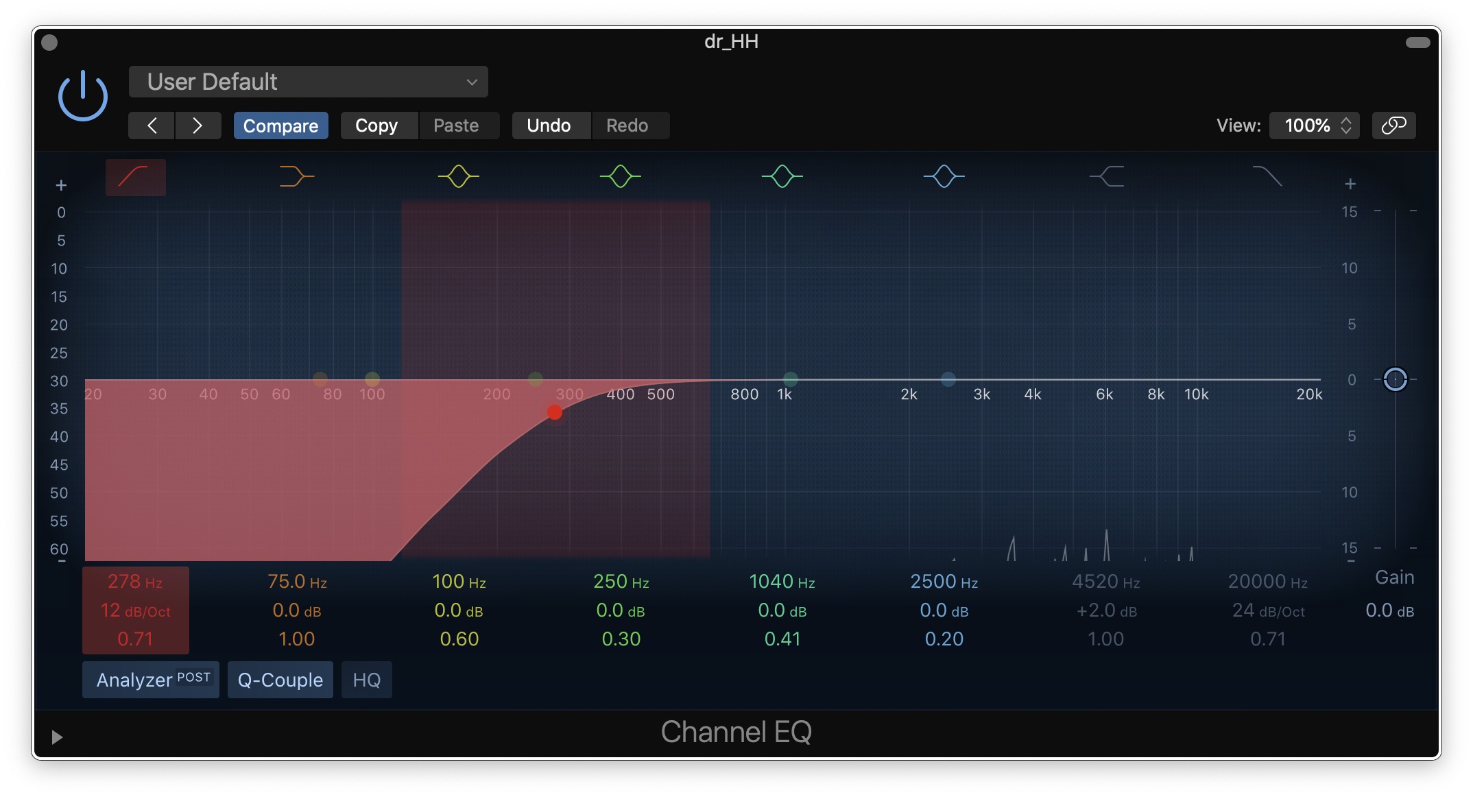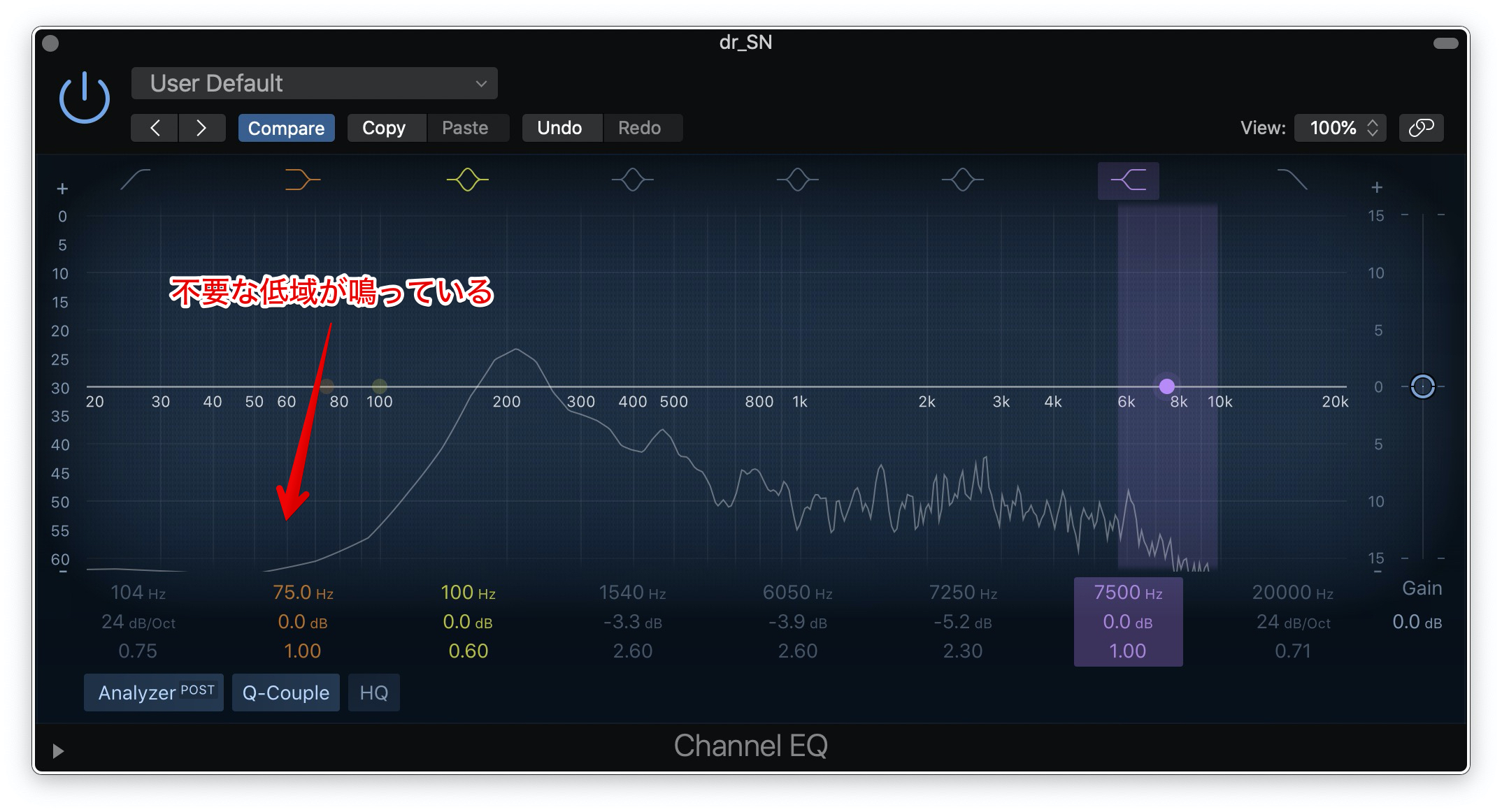バスドラムやベースが主役の帯域まで音が出てしまっているのでそれをカットします。
