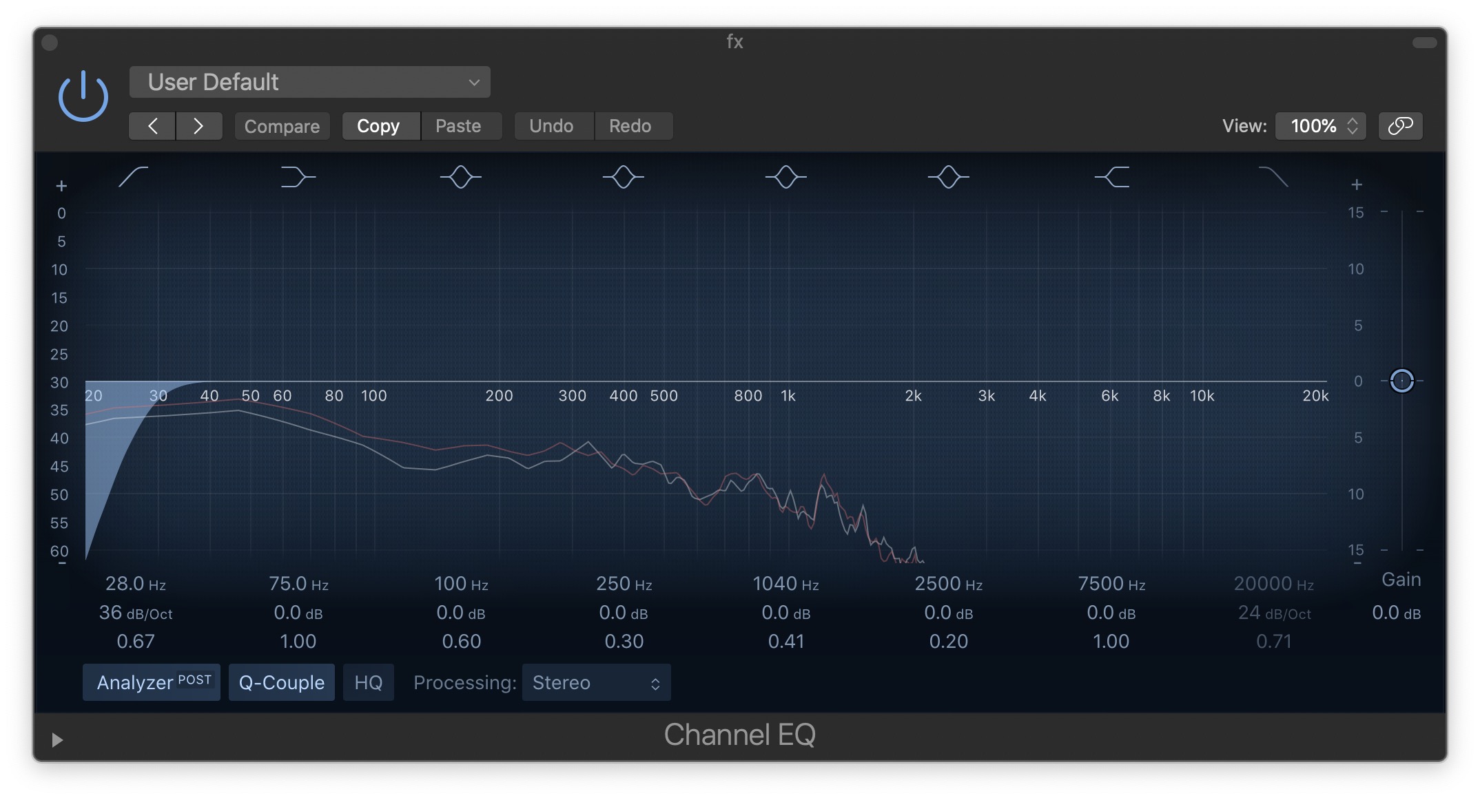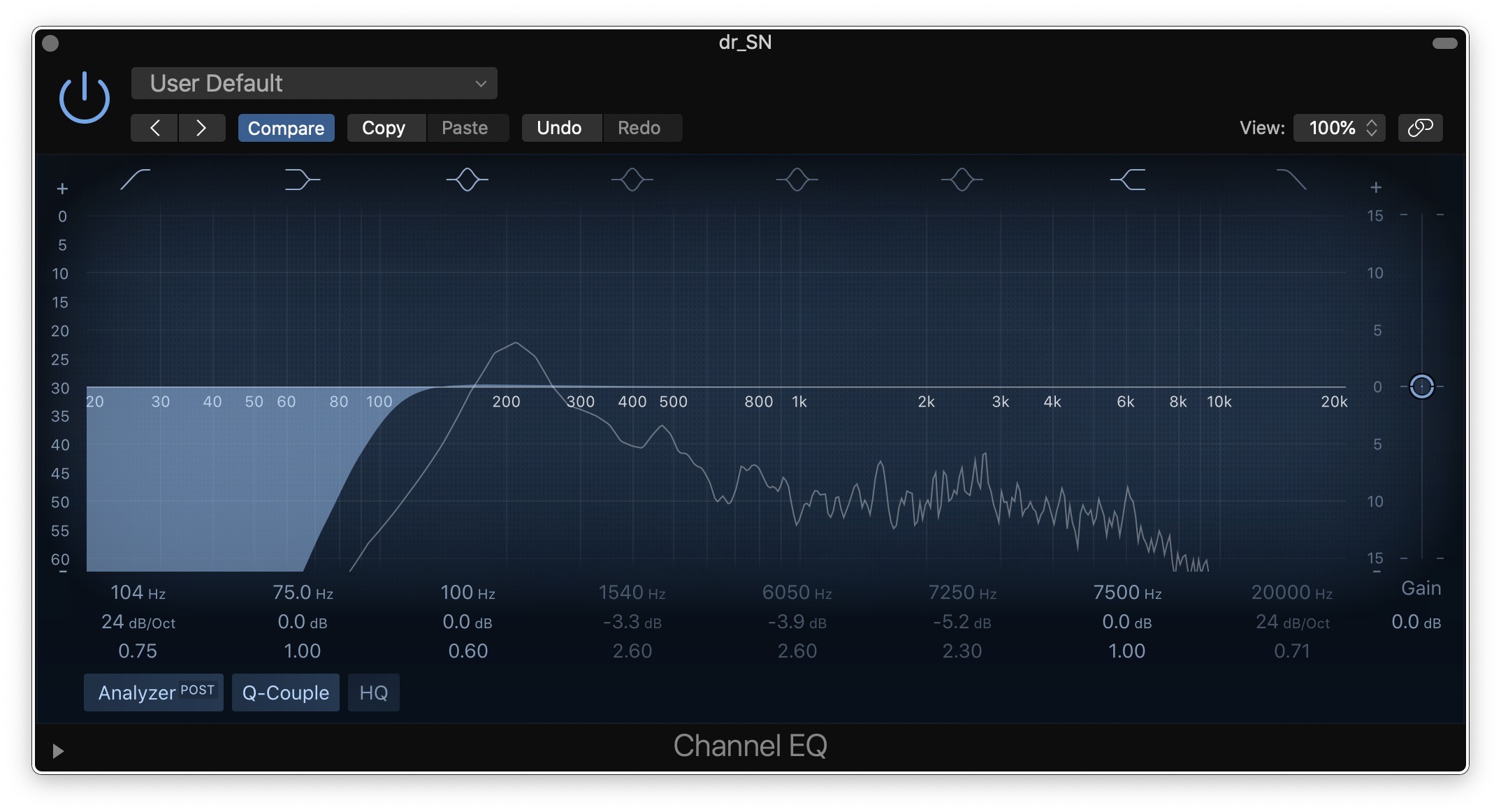 ここでEQをオンの状態とバイパスした状態で音を聴き比べてみましょう。