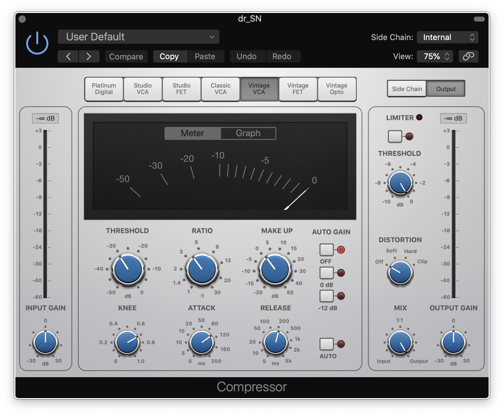 ここで以降すべてのコンプに共通する設定なのですが、「AUTO GAIN」と「AUTO」をオフにします。