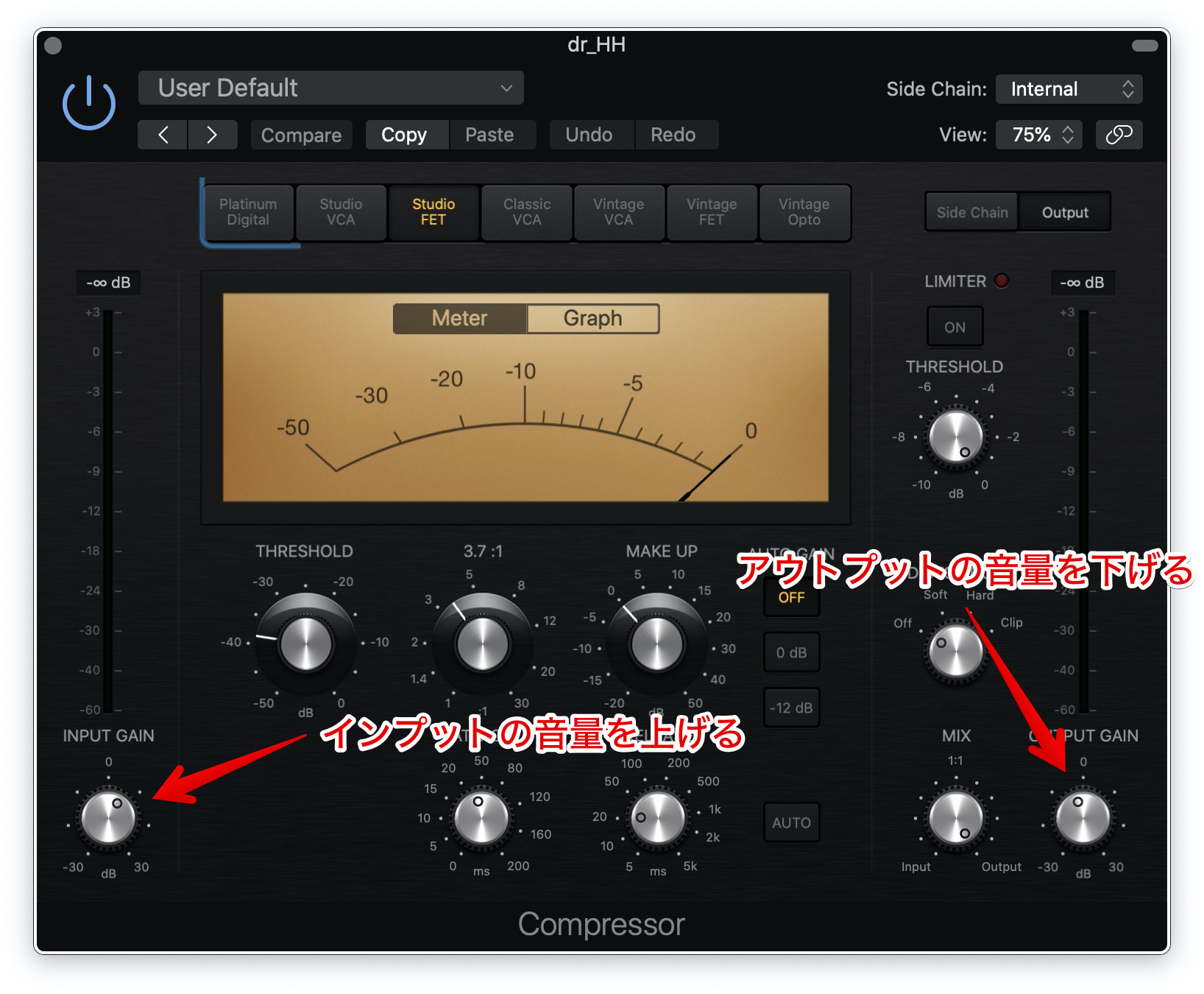 前述の通り、低音部分は積極的にコンプで音を潰して平坦化したいので、