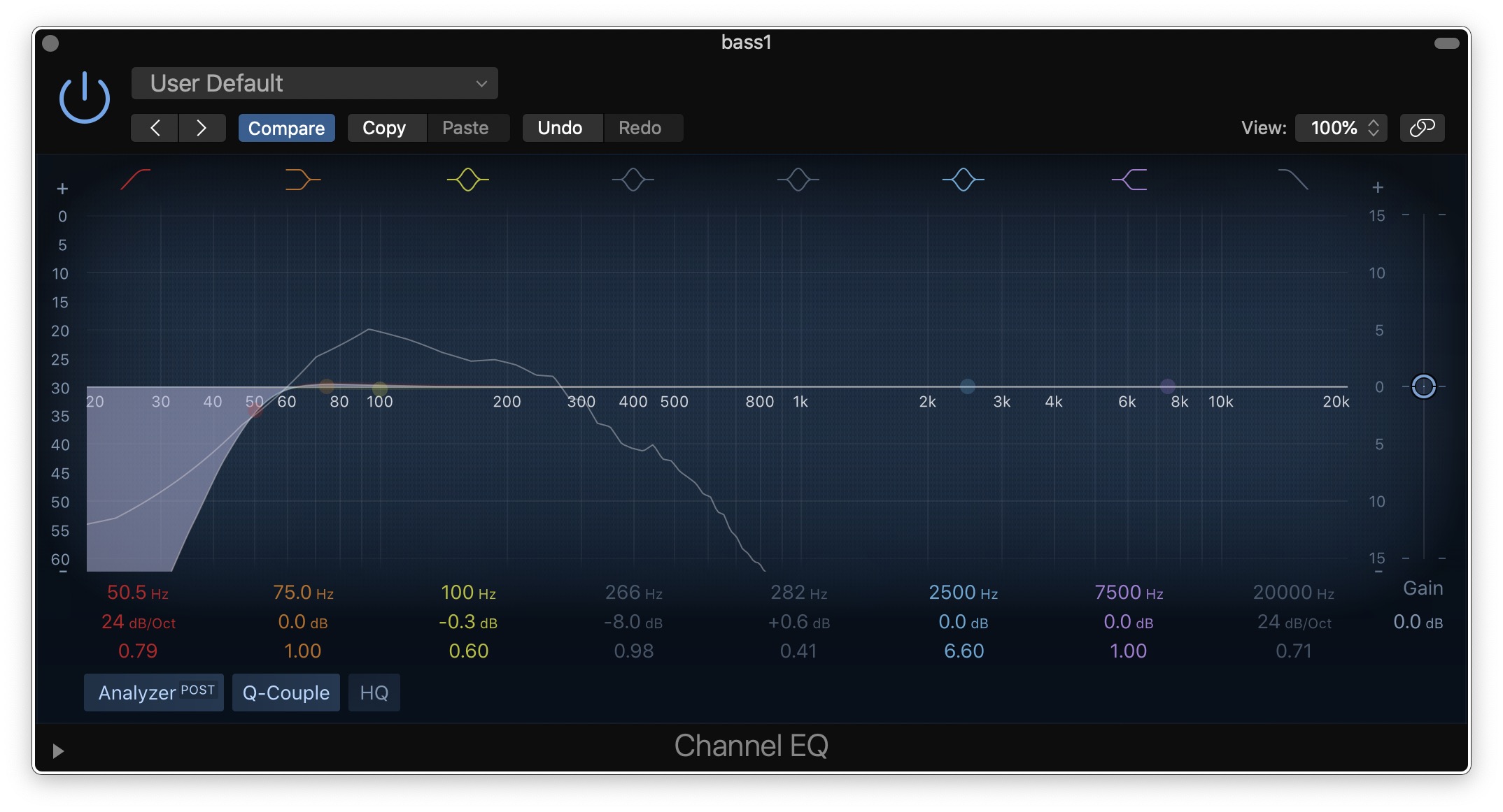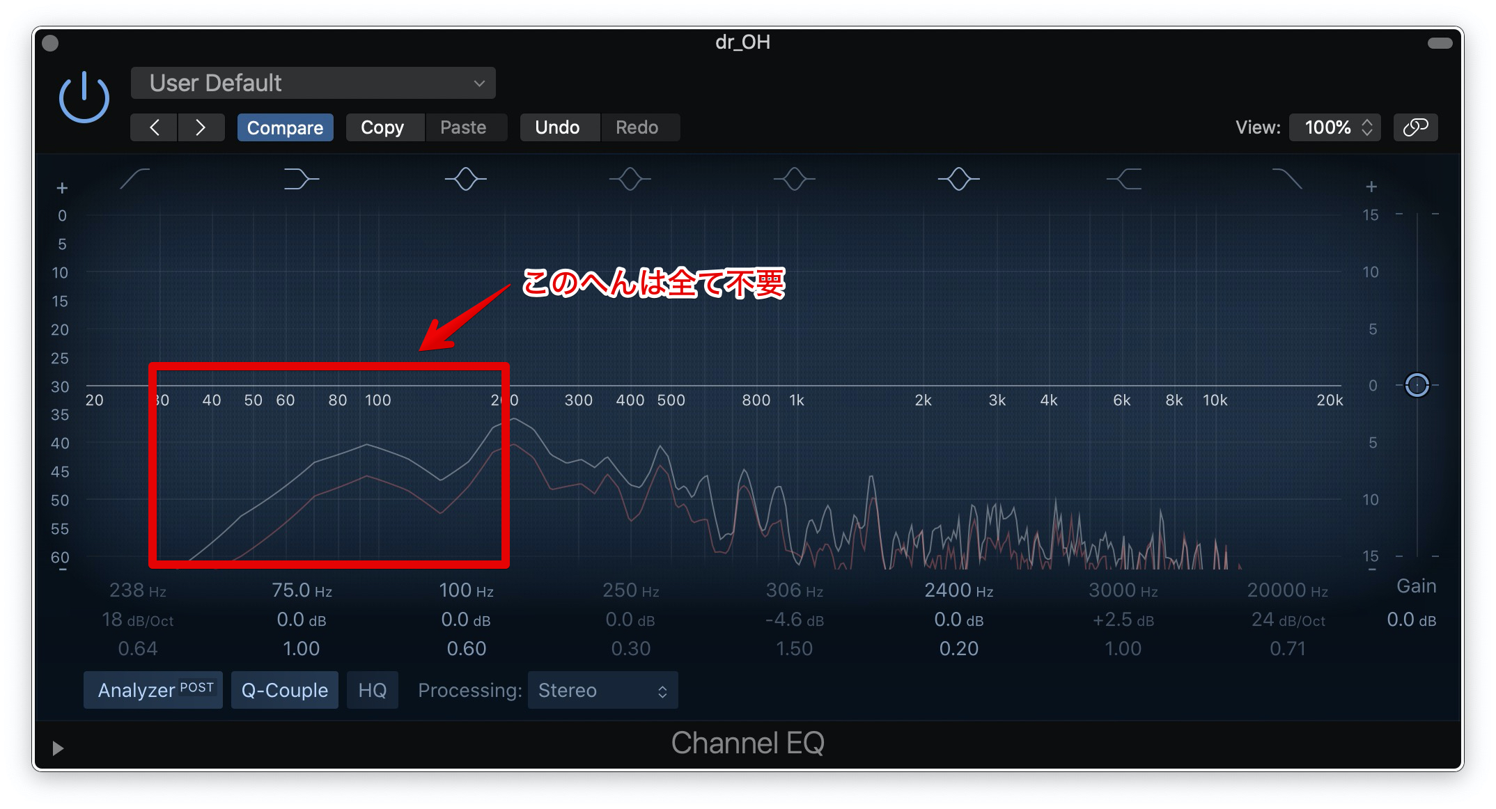 50-100Hzは本来ならばバスドラムと被ってしまう帯域ですが、後にもうひとつの重なり解決方法「サイドチェイン」を行うため、ここでは低音をとっておきます。