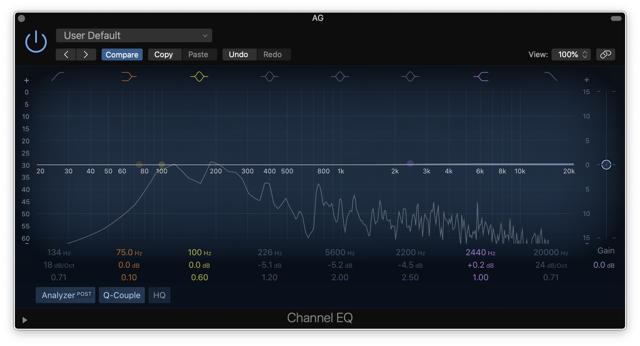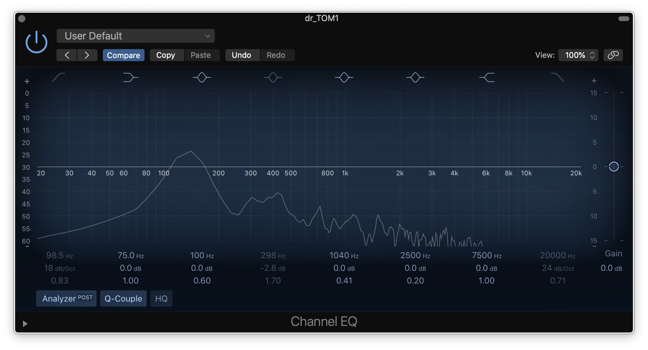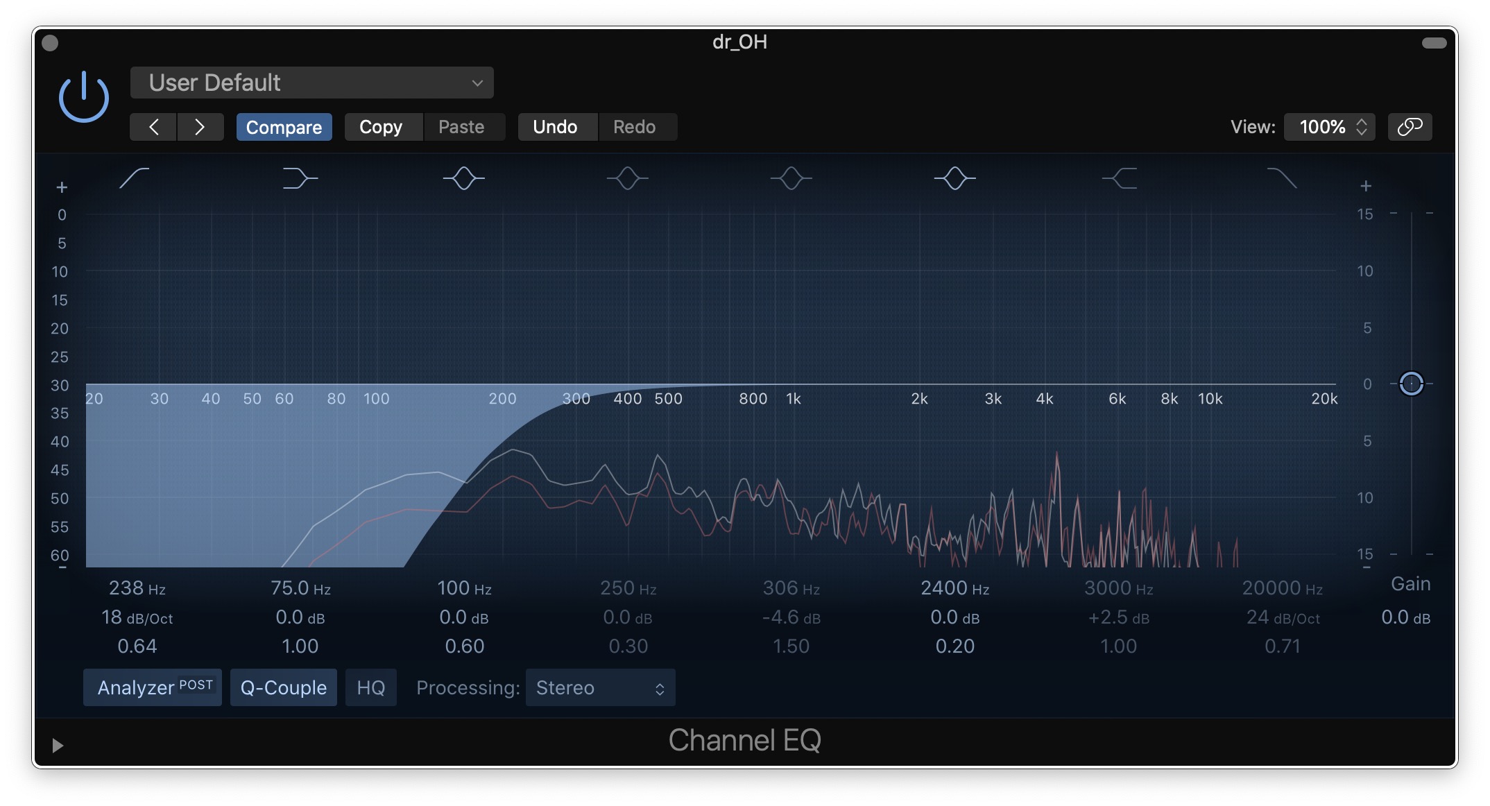 主にローカットと、コンプレッサーによるレベルの均一化をすることが主眼であり、ここではPANの設定などはまだ行いません。